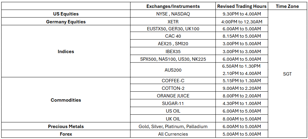 Due to the start of the Daylight Saving Time in the US on Monday, 9 March, there will be changes to the trading hours for the following CFD contract(s):