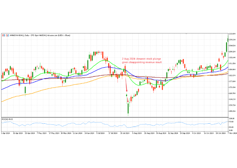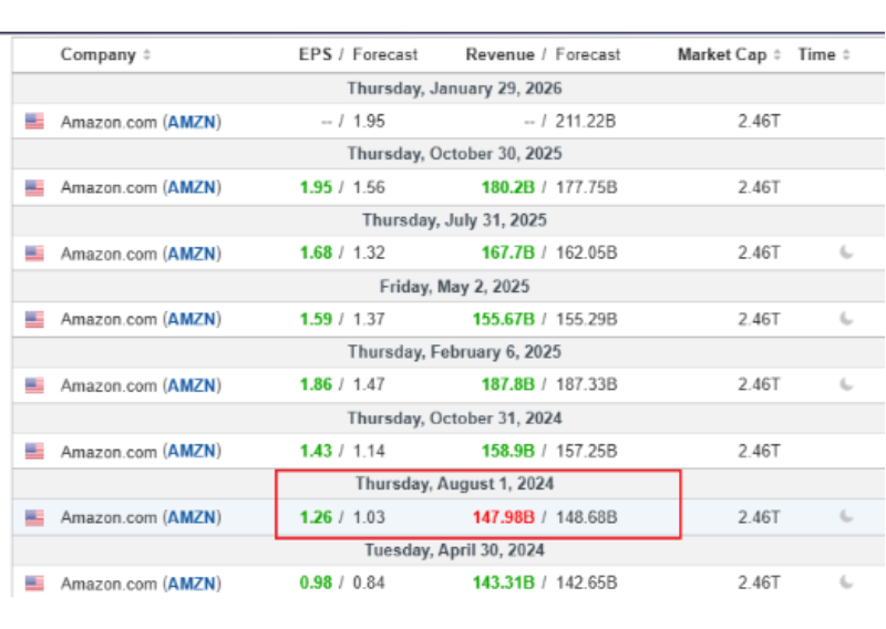 For example, as shown in the calendar above, on 1 August 2024, Amazon released earnings after the US market closed: EPS beat forecasts but revenue fell short. Because Amazon had usually beaten both numbers in past quarters, this revenue miss was a negative surprise. The stock dropped more than 9% on 2 August, and NAS100 also fell by over 2% on the day.