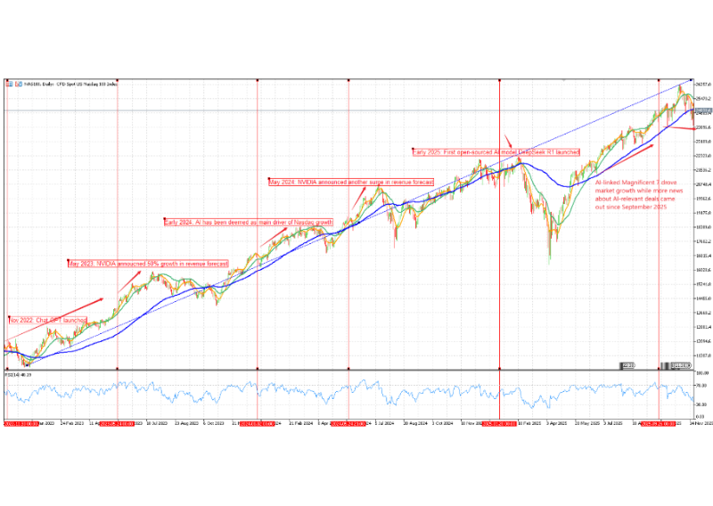 Beyond a single company’s results, bigger themes can drive whole indices for months or years. Since 2023, the clearest example has been artificial intelligence (AI) in the tech-heavy Nasdaq 100 (NAS100). After ChatGPT’s launch in late 2022, investors piled into AI-related tech stocks. Strong revenue forecasts from Nvidia in May 2023 and May 2024 triggered fresh rallies as traders priced in booming demand for AI hardware and cloud services. By early 2025, new AI models in China added competition and made price action choppier. The NAS100 CFD rallied after April led by the “Magnificent 7” tech names increasing their investments in AI, but the move became less stable now as valuations climbed and talk of an “AI bubble” grew.