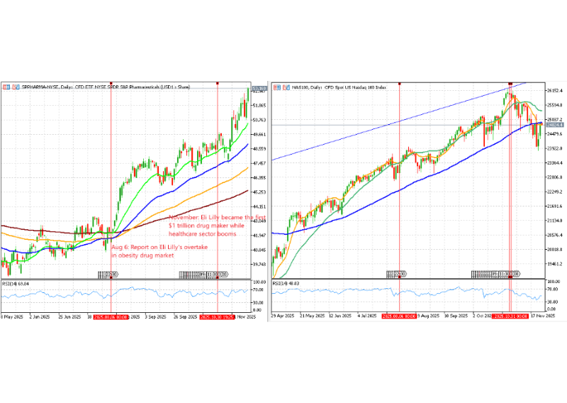 Around the same time, another theme was gaining ground. From August 2025 onward, the SPDR S&P Pharmaceuticals ETF CFD began to trend higher as Eli Lilly’s GLP-1 obesity-drug story strengthened and investors rotated from expensive tech stocks into more defensive healthcare names. Reports about Eli Lilly’s breakthrough in obesity-drug market, and Lilly later becoming the first US$1 trillion drugmaker, helped support that uptrend. In the chart below, the pharma ETF CFD (left) moves steadily higher after August, while the NAS100 CFD (right) turns more volatile over the same period.