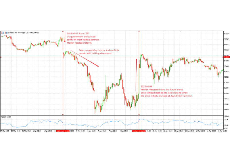 A clear example is 2 April 2025, “Liberation Day”, when US President Donald Trump announced sweeping new import tariffs on most trading partners at 4 p.m. EST. The US market was shocked, and the S&P 500 CFD dropped sharply right after the announcement (2025.04.02 23:00 on Phillip MetaTrader 5 time). Over the next few days, fears about global growth and trade conflict kept pressure on prices and the index pushed even lower. By 9 April, however, as investors gathered more information and reassessed the risks, the market had bounced back to the level where it first plunged.