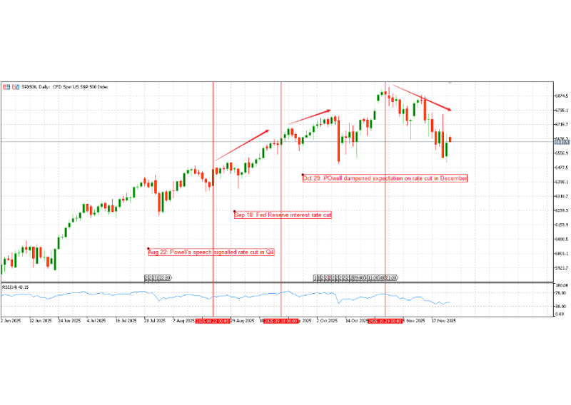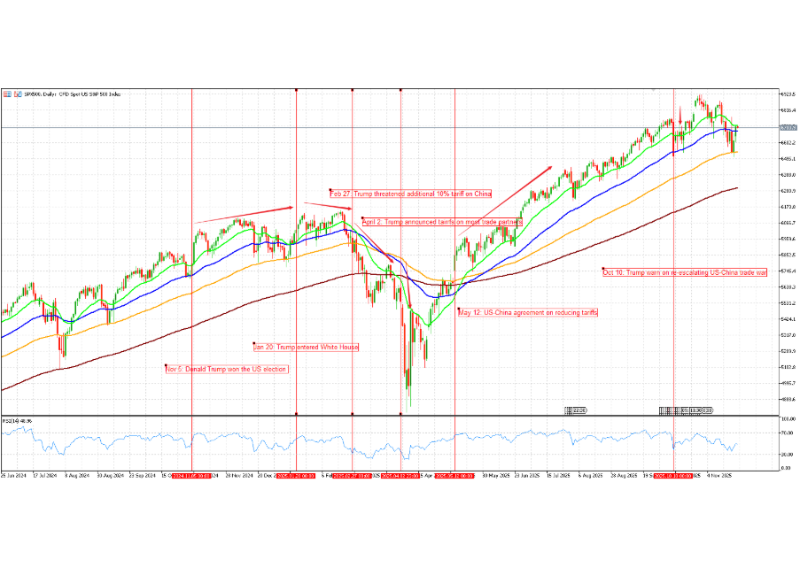 Subsequent headlines on China added another layer of uncertainty. Restrictions on Chinese investments and the threat of extra tariffs in February, followed by broader tariffs on more trade partners on 2 April, led to sharp drops in the S&P 500 Index CFD as worries about global growth and profits increased. In contrast, the US–China agreement to reduce tariffs on 12 May eased some of those fears and helped the S&P 500 CFD back into an uptrend, which later faced another pullback on 10 October when Trump warned tariffs on China could rise again.