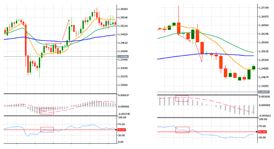 Buy signal (left figure): The MACD histogram crosses above the signal line (dash line), supported by the RSI climbing toward but below 50.