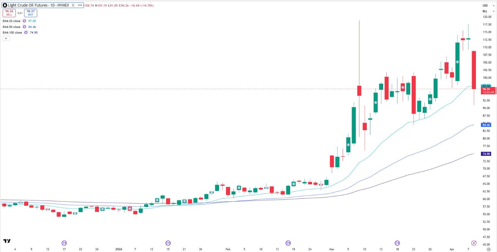 The easing of tensions has led investors to anticipate a potential reopening of the Strait of Hormuz, a critical passage that accounts for over 20% of global oil flows. As of this morning, WTI crude trades near $96.67 per barrel, while Brent has slipped to $94.56, reflecting a rapid unwinding of geopolitical risk premiums.