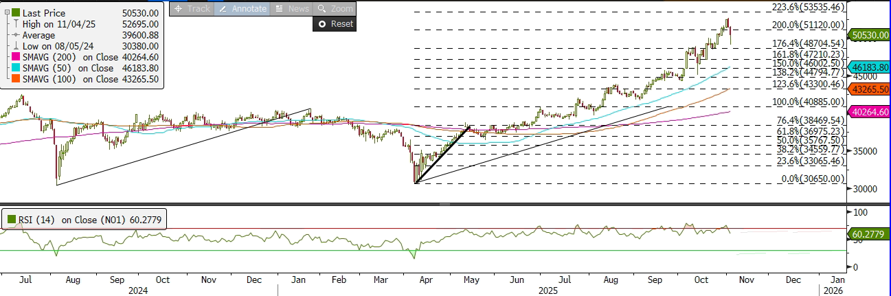 As of 5 November, 14:30 SGT, the Nikkei 225 stood at 50,212, down by -2.50% on the day but still up +25.86% YTD in JPY terms after a strong +16.63% rally in October. The selloff was likely driven by an overnight slump in US Tech, with AMD dropping in postmarket trading following a mixed earnings report. This came alongside warnings from Wall Street CEOs, including Morgan Stanley’s Ted Pick and Goldman Sachs’ David Solomon, whom said that investors should brace for an equity drawdown of more than 10% in the next 10-12 months, and that such a correction is a normal feature of market cycles. Capital Group’s Mike Gitlin also mentioned that corporate earnings are strong but valuations are challenging. Furthermore, Michael Burry, the fund manager known for The Big Short, disclosed bearish puts on Palantir and Nvidia In post-market trading,