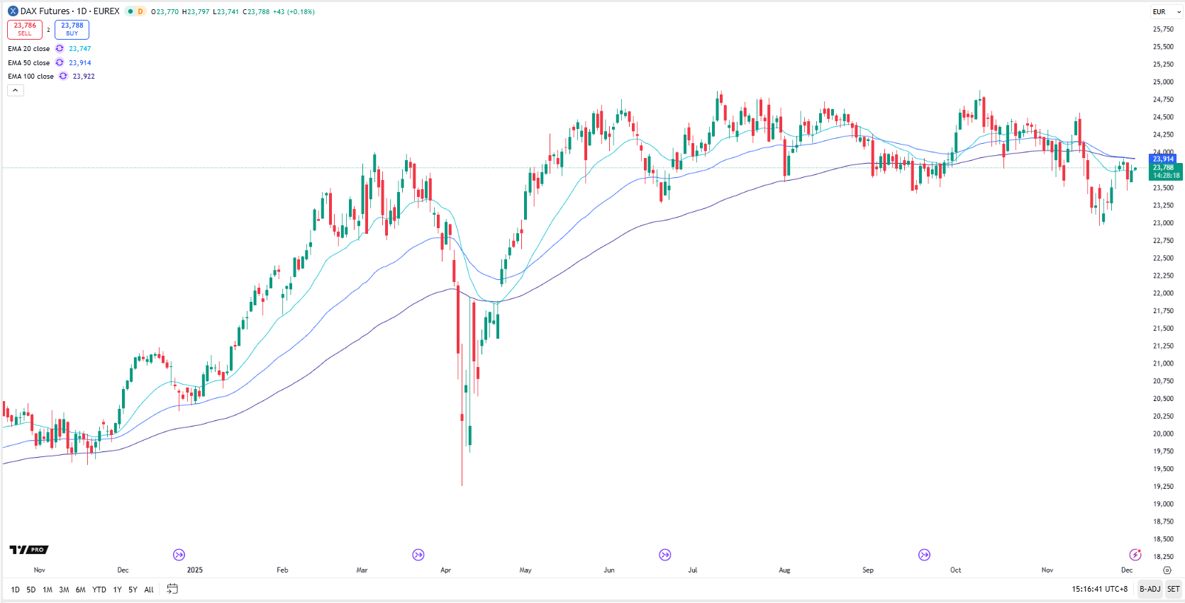 The DAX stood at 23,695 points on Monday morning, slightly below Friday’s closing level of 23,837 points. The US stock markets continued to recover on “Black Friday” with shortened trading hours and are not far from their record highs. The situation with cryptocurrencies remains striking: after temporarily exceeding US$90,000, Bitcoin is currently trading at only US$86,000 again – around 30 percent below its all-time high.
