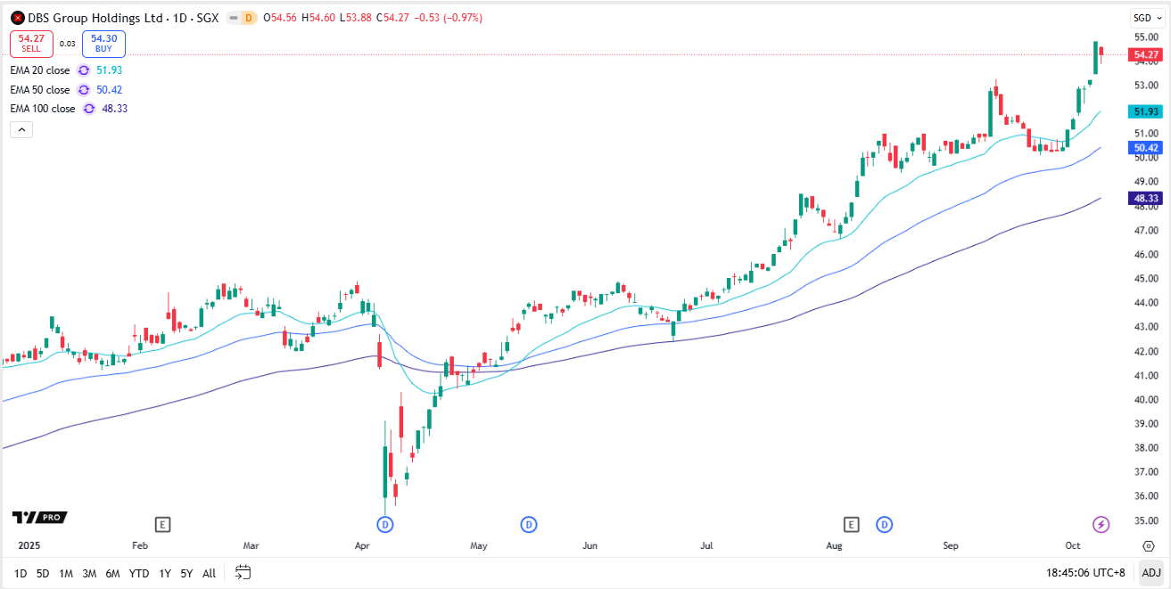 DBS (SGX: DO5) shares jumped 3% to close at S$54.80 on Tuesday, 7 October 2025, marking a new all-time high and extending a rally that has lifted the stock close to 25% year-to-date.