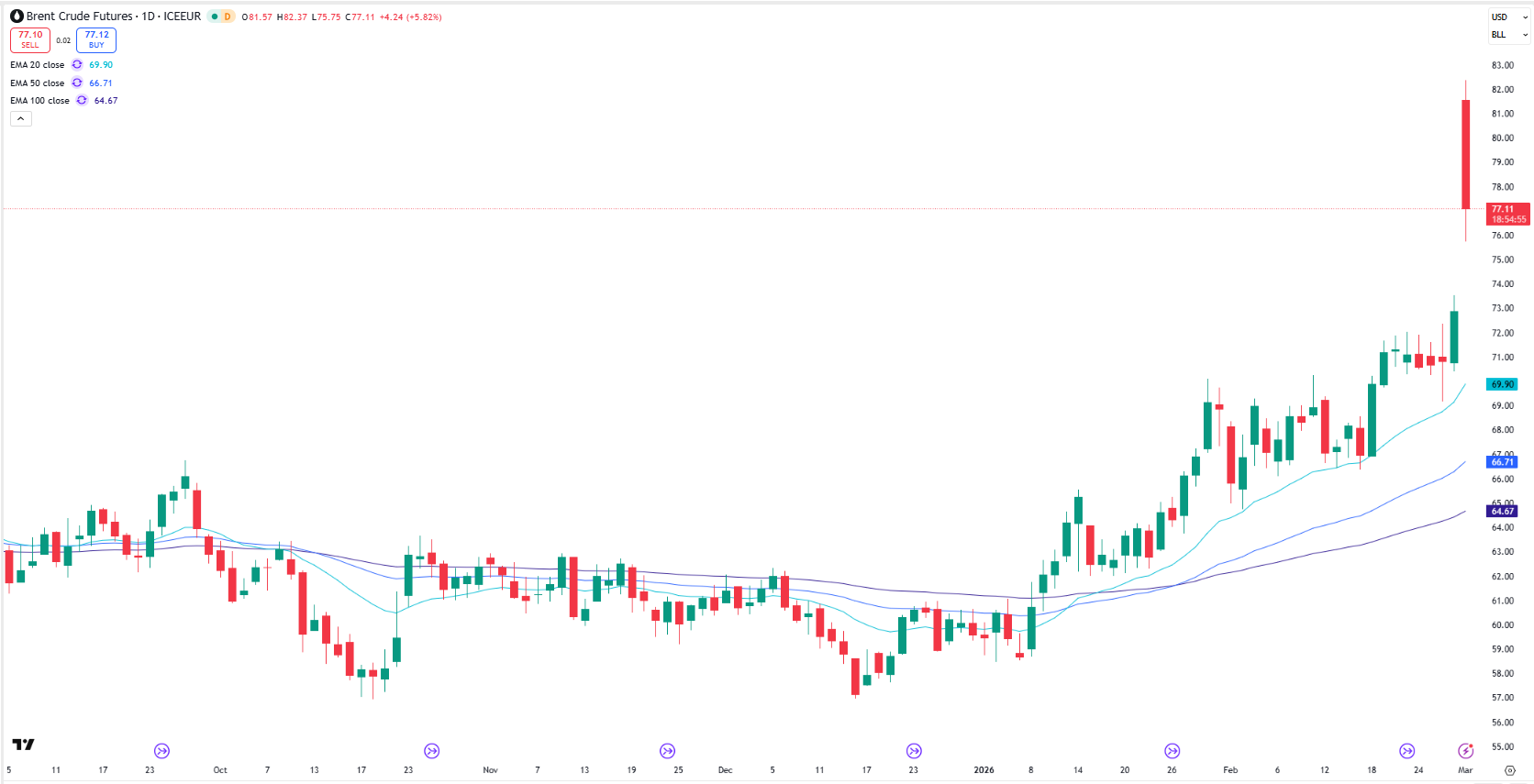 Crude oil prices reacted sharply to the escalation, opening higher in early Asian trading as supply risks came into focus. Brent crude briefly moved above $80 per barrel, levels not seen since January 2025, before partially retracing gains.