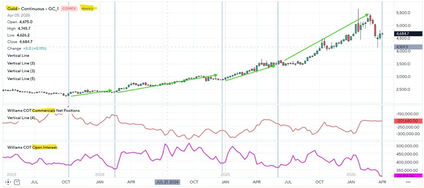 Historically, each time the commercials’ net positions moved toward a less-short or net-long posture during these low-interest periods, a new green “accumulation arrow” appeared on the price chart, sparking the next multi-hundred-dollar rally.
